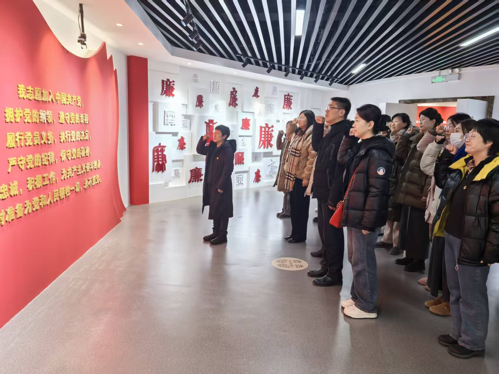 在教育基地讲解员的带领下,首先集中观看了《全面从严治党永远在路上》专题纪录片,深刻感受党中央推进自我革命的坚定决心。依次参观了“初心使命”“警钟长鸣”“利剑高悬”等主题展区,深入学习了党的纪律建设历程与成效。通过翔实的图文资料、震撼的影像画面、典型的案例剖析,以“身边案”警醒“身边人”,敲响了拒腐防变的警钟。学院党委副书记兼纪委书记密佳音带领党员重温入党誓词。